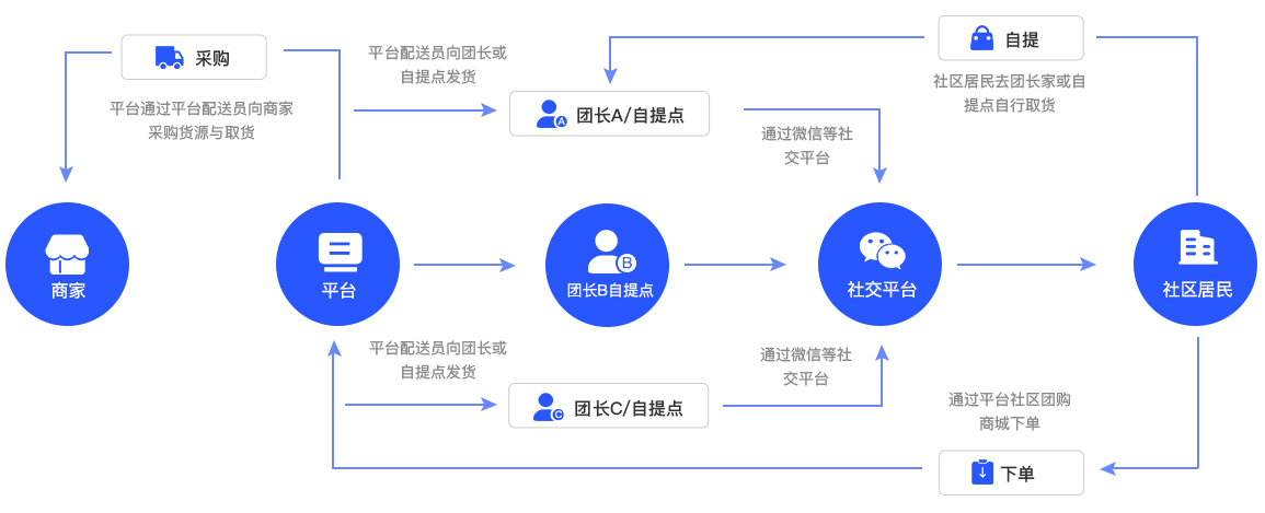 社区居民通过进入社区店(团长)商城小程序下单,平台整合社区店订单,供应商按照订单量进行备货,平台配送人员以社区为单位进行采购和配送,社区店(团长)签收完成后,提示社区居民到社区店(团长)核销提货)。
